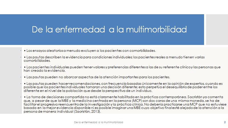 La medicina basada la evidencia es un enfoque de la práctica clínica dirigido a optimizar la toma de decisiones según la evidencia disponible, la experiencia adquirida en la atención del problema en cuestión y los valores y preferencias de las personas. Bajo esta premisa, en los últimos decenios se han creado guías de práctica clínica orientadas a mejorar la atención de las personas de acuerdo con un conjunto de recomendaciones basadas en una revisión sistemática de la evidencia y en la evaluación de los riesgos y beneficios de las diferentes alternativas, con el objetivo de optimizar la atención sanitaria a los pacientes, cosa que ha contribuido a mejorar de forma significativa la atención mediante la generación de estándares de cómo se ha de suministrar la atención en una determinada condición. Este enfoque, que es excelente para un gran número de personas en las que existe un alto grado de certidumbre sobre el diagnóstico y la toma de decisiones, a menudo resulta insuficiente para la población con gran carga de multimorbilidad.