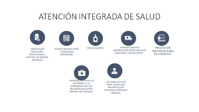 Además, integrar la promoción con los hábitos saludables, la prevención primaria, secundaria, terciaria y cuaternaria, la curación, el cuidado, la rehabilitación, los cuidados paliativos, la atención domiciliaria y los cuidados especiales. Técnicamente eso se denomina prestación integral.