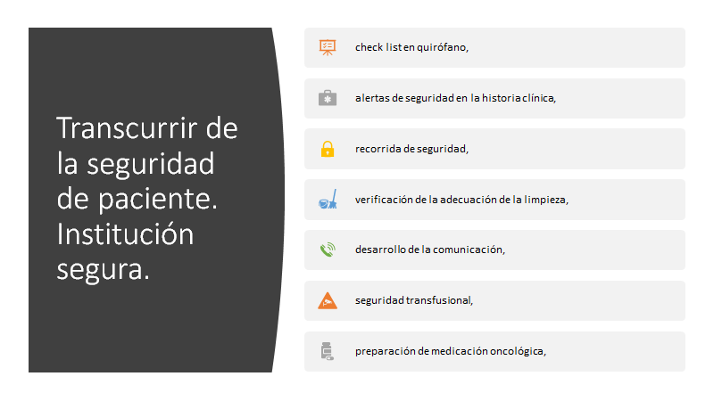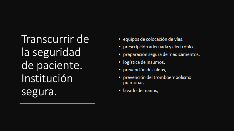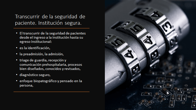 El transcurrir de la seguridad de pacientes desde el ingreso a la institución hasta su egreso institucional: es la identificación, la preadmisión, la admisión, triage de guardia, recepción y comunicación prehospitalaria, procesos bien diseñados, conocidos y revisados, diagnóstico seguro, enfoque biopatográfico y pensado en la persona, equipos de colocación de vías, prescripción adecuada, preparación segura de medicamentos, logística de insumos, prevención de caídas, prevención del tromboembolismo pulmonar, lavado de manos, check list en quirófano, alertas de seguridad en la historia clínica, recorrida de seguridad, verificación de la adecuación de la limpieza, desarrollo de la comunicación, seguridad transfusional, preparación de medicación oncológica, continuidad de atención, mayor presencia de los decisores, actividades de mutuo control médico, capacitación continua, evitar la sobrecarga laboral de médicos, enfermeros, camilleros e instrumentadoras, conciliar la medicación en las transferencias, enfermería de vinculación, pase de guardia, prescripción electrónica, farmacia clínica, buena calidad de insumos y medicamentos, estiba adecuada y segura, suministro trazado, participación del paciente y la familia, y la atención centrada en la persona. Epicrisis, medicación de alta, interconsultas, servicios de postventa, vinculación con la atención primaria.