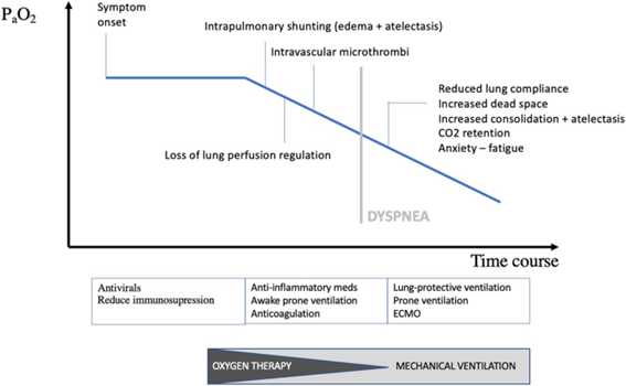 Como en los primeros días de la enfermedad, la mecánica pulmonar está bien conservada y no hay una mayor resistencia de las vías respiratorias ni ventilación del espacio muerto. Por lo tanto, el centro respiratorio no siente una sensación incómoda de respiración. Sin embargo, puede producirse una descompensación respiratoria rápida y repentina, y la taquipnea y la hiperpnea podrían ser los signos de advertencia clínicos más importantes de insuficiencia respiratoria inminente en pacientes con COVID-19.