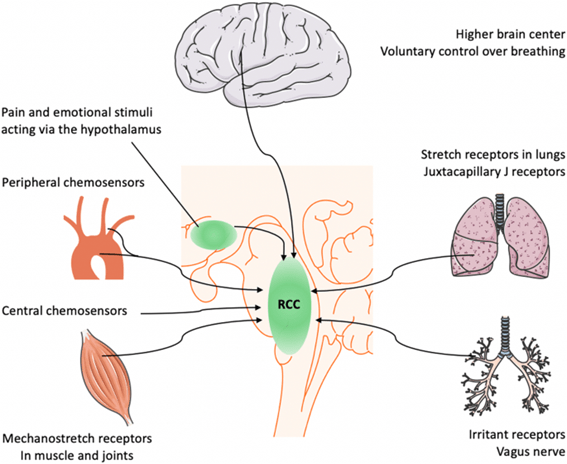 La entrada principal que afecta el impulso respiratorio se deriva de la retroalimentación química entre los quimiorreceptores periféricos y centrales. Sin embargo, el centro también está influenciado por la corteza cerebral superior, la nocicepción integradora hipotalámica, la retroalimentación de los receptores de estiramiento mecánico en los músculos y los pulmones, y la tasa metabólica.