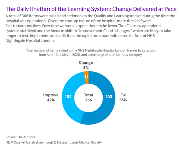 Pocas organizaciones de prestación de atención médica están estructuradas como sistemas de aprendizaje. Los procesos de capacitación y acreditación se centran en el aprendizaje individual y el modelo de la medicina basada en la evidencia se basa en la presunción de que los nuevos conocimientos se crean a través de la investigación y se implementan en la práctica por las organizaciones de administración, en parte porque las normas probatorias de la atención de la salud favorecen la aleatorización y las muestras grandes. El diseño de un sistema de aprendizaje para el Nightingale no sólo tuvo que acomodar el ritmo rápido al que la evidencia médica estaba evolucionando y hacer frente a la avalancha de rumores, hipótesis no confirmadas y anécdotas entregadas diariamente a través de las redes sociales, sino que también tuvo que abordar varios problemas prácticos para obtener datos de la cabecera y devolverles el cambio. Por ejemplo, el registro electrónico era de alcance limitado, la escritura era difícil cuando usaba equipo de protección personal