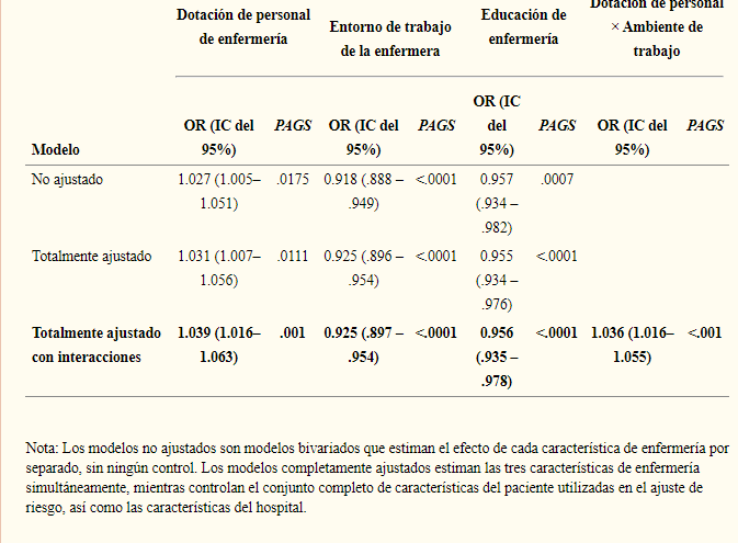 Las proporciones más altas de pacientes por enfermeras aumentan las probabilidades de muerte de los pacientes y de fallas en el rescate, mientras que mejores entornos de trabajo y porcentajes más altos de enfermeras BSN disminuyen esas probabilidades.