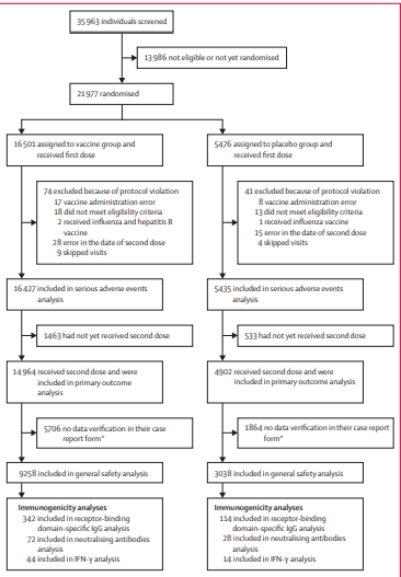 La vacuna fue bien tolerada, con 45 (0-3%) de 16 427 participantes en el grupo vacunata que informaron de acontecimientos adversos graves, todos los cuales se consideraron no relacionados con la vacuna.
