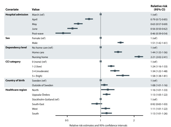 Un análisis multivariable de RR de muerte de 60 días se muestra en la Fig. 3,en el que el sexo, la comorbilidad, la dependencia de la atención, el país de nacimiento, la región de salud y el mes de admisión se modelan como efectos principales. Factores de riesgo establecidos como ser hombre, residentes en residencias de ancianos y con un CCI de más de 5 años se asociaron con un aumento de la mortalidad con RR de 1·51 (IC del 95%, 1·42 a 1·61), 2·21 (IC del 95%, 2·02 a 2·41) y 1·58 (IC del 95%, 1·38 a 1·81), respectivamente. Además, después de ajustarse a las características basales del paciente, todas las regiones sanitarias excepto el sureste se asociaron con una mortalidad mayor que la referencia Estocolmo-Gotland (Fig. 3). Sin embargo, el mayor factor de riesgo de muerte fue la edad, con un RR de 10·7 (IC 95% 9·07 a 12·70) por ser ≥80 años de edad en relación con < 60 años (obtenido al modelar la edad como variable categórica, ajustando para el mes de admisión, sexo, CCI, dependencia de la atención, país de nacimiento y región de salud).