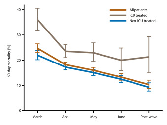 Como 2943 pacientes murieron durante la ventana de seguimiento de 60 días después del ingreso, la proporción total de mortalidad de 60 días fue del 17·2% (IC del 95%, 16·6% a 17·4%), fue de 25·3% (IC del 95%, 23·6% a 27·1%) entre los pacientes ingresados en la UCI y el 15·9% (IC del 95%, 15·3% a 16·5%) entre los pacientes no ingresados en la UCI.