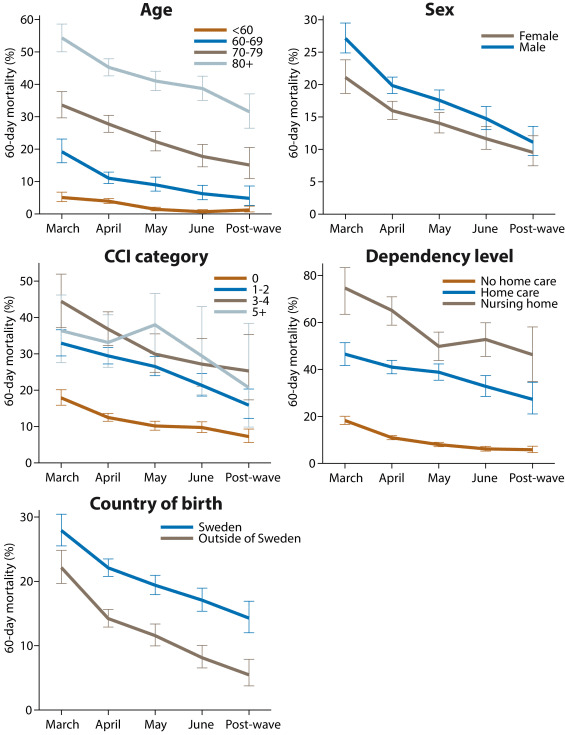 la alta carga de nuevos ingresos y de pacientes en la atención hospitalaria de COVID-19 en marzo y abril puede haber contribuido a la alta mortalidad inicial. Esta noción está respaldada por el resultado de la región sanitaria Estocolmo-Gotland, que tuvo el mayor número de nuevas admisiones de COVID-19 por residente en marzo-abril y también la disminución más prominente de la mortalidad. Sin embargo, el mensaje es complejo, ya que la región de Estocolmo-Gotland tuvo la mortalidad más baja en junio a pesar de seguir teniendo la tasa más alta de admisiones de COVID-19 por población ,y su RR global ajustado de 60 días de muerte fue menor que la de otras cuatro regiones