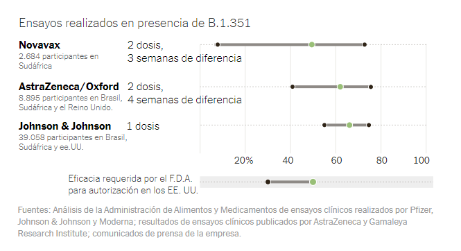 Hasta ahora, tres vacunas — fabricadas por Pfizer y BioNTech, Moderna y Johnson & Johnson — han sido autorizadas en los Estados Unidos después de que sus ensayos demostraran que superaron el umbral de la F.D.A. AstraZeneca y Novavax, que tienen ensayos en curso en Estados Unidos, han publicado resultados de eficacia de estudios en otros países. Mientras tanto, los fabricantes de la vacuna Sputnik V han publicado resultados basados en su ensayo en Rusia.