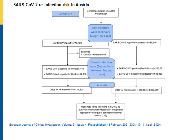 Se documento en esta publicación un riesgo relativamente bajo de reinfección para el SRAS‐CoV‐2 en la población general de Austria mediante el uso de datos del ERS. Los pacientes con reinfecciones abarcaron ambos sexos, un amplio rango de edad e incluyeron también a pacientes que fueron hospitalizados durante ambas infecciones.