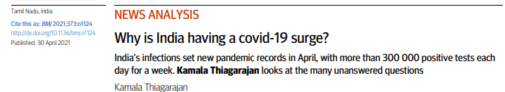 El 26 de abril, la India registró el recuento diario más alto de nuevas infecciones por SARS-CoV-2 jamás registradas en el mundo, 360 960, llevando su total de pandemias a 16 millones de casos, sólo superado por Estados Unidos, y más de 200 000 muertes.
