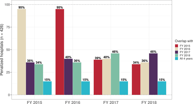 Encontramos la mayor superposición en los hospitales penalizados entre el año fiscal 2015-2016, lo que refleja un cambio de puntuación relativamente modesto entre estos dos años, la introducción de SSI en el Dominio 2 (Fig. 2 ). Sin embargo, cuando comparamos los hospitales sancionados entre los métodos de puntuación del año fiscal 2016 y 2017, la superposición disminuyó a solo el 40% ( n = 169 de 426). Esta disminución fue completamente atribuible a la reponderación de los PSI individuales en el Dominio 1, porque la mayoría de los hospitales sancionados ( ∼ 60%) no informaron ninguna medida del Dominio 2. De manera similar, la falta de superposición entre los hospitales penalizados del año fiscal 2017 y 2018 también fue impulsada por otra recalibración del PSI-90.