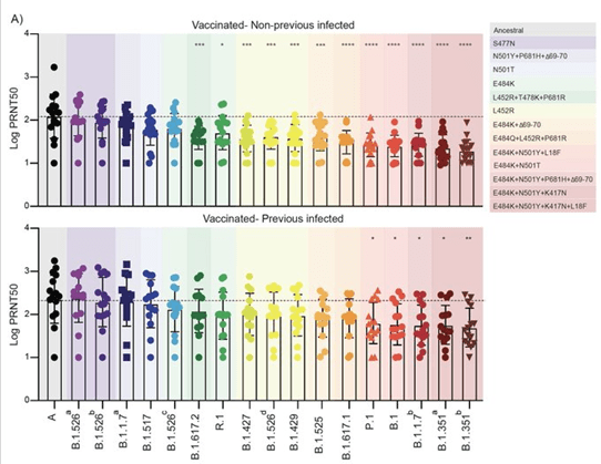 Por lo tanto, nuestros datos sugieren que la actividad de neutralización plasmática contra las variantes de SARS-CoV-2 mejore en individuos vacunados previamente infectados con el virus. Estos resultados sugieren que los futuros refuerzos de la vacuna (tercera dosis) pueden ayudar a superar la reducción de la capacidad de neutralización observada para las variantes, en particular las de los genotipos con el L452R (por ejemplo, B.1.617.2) o la combinación E484K y N501Y (por ejemplo, P.1 y B.1.351).