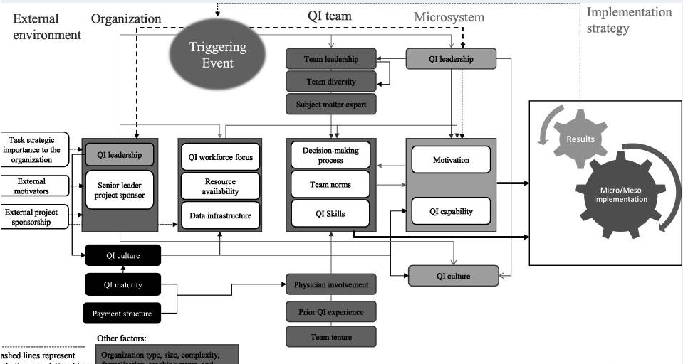 A partir del estudio de los elementos contextuales descritos hasta ahora, algunos autores han desarrollado modelos para evaluar el impacto del contexto en la implementación de actividades de mejora organizacional. Kaplan et al. [36] presentaron el Modelo para Comprender el Éxito en la Calidad (MUSIQ). Los autores identificaron 25 factores contextuales clave en diferentes niveles organizacionales que influyen en el éxito de los esfuerzos de mejora de la calidad. Definieron cinco dominios: el microsistema, el equipo de mejora de la calidad, el soporte y la capacidad de mejora de la calidad, la organización y el entorno externo. Kaplan et al. [36] sugieren que una organización que ignora los factores contextuales está condenada a fracasar en la implementación de un programa de mejora; una organización que adopta una estrategia de implementación apropiada para el contexto puede cambiar el resultado al activar facilitadores de implementación. Estudios previos de adopción lean en HSs sugieren que el ajuste entre el enfoque adoptado y las circunstancias influirá en las posibilidades de éxito [3, 12, 34].