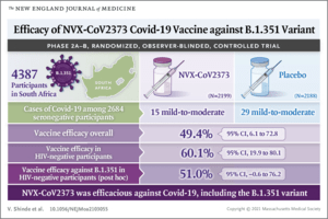 Se encontró que un régimen de dos dosis de la vacuna NVX-CoV2373 administrada con 21 días de diferencia era seguro y 89.7% efectivo contra covid-19 sintomático causado por variantes B.1.1.7 y no B.1.1.7. El momento de los casos acumulados en este ensayo permitió una evaluación post hoc de la eficacia de la vacuna contra cepas que incluían la variante B.1.1.7, que ahora está circulando ampliamente fuera del Reino Unido y era la cepa más extendida notificada en los Estados Unidos en el momento de este informe.15 (Cuadro S5). Se sabe que esta variante es más transmisible y está asociada con una tasa de letalidad más alta que las cepas anteriores.7 La eficacia de la vacuna fue mayor que la asociada con la vacuna ChAdOx1 nCoV-19 (AstraZeneca) (70,4%) en un ensayo de fase 2-3 más pequeño.16