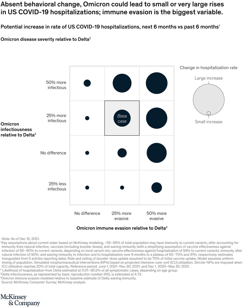 Con base en la evidencia hasta la fecha, se infiere que Omicron es aproximadamente un 25 por ciento más infeccioso, evade la inmunidad previa en un mayor grado (25 por ciento) y causa una enfermedad menos grave, nuevamente en aproximadamente un 25 por ciento, todos relativo a Delta. El análisis sugiere que en los Estados Unidos, esta combinación de características llevaría a que Omicron reemplazò a Delta como la variante dominante en los próximos meses y a una carga máxima de enfermedad más alta que la que vio ese país en la segunda mitad de 2021 (pero probablemente por debajo de el pico alcanzado en el invierno de 2020-21). Este escenario tiene el potencial de ejercer una gran presión sobre los sistemas de salud. La visión realista prevé un pico de carga de enfermedad record de lo observado, Tenga en cuenta que en todos los escenarios, esta inferencia indica que las hospitalizaciones probablemente crecerán más lentamente.