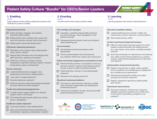 El Grupo de Trabajo de Educación del Consorcio Nacional de Seguridad del Paciente verificó el papel crítico que desempeña el liderazgo superior para garantizar que la seguridad del paciente sea una prioridad organizacional. Un grupo de trabajo de socios, dirigido por el Instituto Canadiense de Seguridad del Paciente, el Colegio Canadiense de Líderes de Salud (CCHL), HealthCareCAN y el Seguro de Salud Recíproco de Canadá (HIROC) se reunieron para establecer un marco y avanzar en este trabajo.