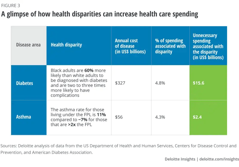 Abordar las desigualdades en salud puede ayudar a los líderes del sector, dirigentes, las juntas directivas y las empresas a mejorar los resultados de salud y reducir el gasto en atención médica al abordar los impulsores de la salud (DOH), eliminar los sesgos y las ineficiencias en la atención y permitir que los datos y la tecnología ayuden a monitorear, diagnosticar, y brindar atención. A su vez, este enfoque puede tener un impacto positivo en los resultados de salud, la experiencia del paciente, la calidad de vida y la mayor salud y bienestar de todas las personas. El sector de la atención médica está bajo presión para reducir el gasto en atención médica y al mismo tiempo aumentar la calidad de la atención. Las persistentes inequidades en salud tienen un impacto sustancial en los resultados y el gasto en salud. Las disparidades en salud representan aproximadamente $42 mil millones en pérdida de productividad por año, sin incluir pérdidas económicas adicionales debido a muertes prematuras. 2 Las disparidades en la salud también pueden tener consecuencias devastadoras en la calidad y el valor de vida de las personas, familias y comunidades más afectadas. Además de los beneficios sociales de abordar las disparidades en salud, priorizar la equidad en salud podría ayudar a las partes interesadas a lograr sus objetivos al reducir el gasto innecesario en atención médica y mejorar los resultados de salud y la experiencia del paciente. Además, los beneficios de abordar las inequidades en salud se extienden más allá de la reducción de gastos innecesarios. Hacer que la salud sea equitativa podría extender la esperanza de vida, mejorar la calidad de vida y permitir la capacidad de prosperar como individuos, comunidades y sociedad. la atención médica pasará del tratamiento de enfermedades a la promoción de la salud y el bienestar mientras se abordan las causas profundas de las desigualdades en salud. El gasto innecesario en atención médica debido a desigualdades y sesgos estructurales está bien documentado. Las investigaciones han demostrado que el gasto en atención médica tiende a ser mayor entre ciertas poblaciones debido a la atención tardía, los desafíos de acceso, los diagnósticos perdidos y el acceso limitado a los últimos avances científicos, así como a los servicios preventivos adecuados. 5 Un estudio de 2011, “Estimación de la carga económica de las desigualdades raciales en salud en los Estados Unidos ” , calculó los costos directos e indirectos de las disparidades raciales y étnicas en la atención médica. 6 Este estudio ha sido una base para la industria y fue útil para cuantificar el vínculo entre el gasto en atención médica y las desigualdades en salud en nuestro modelo.