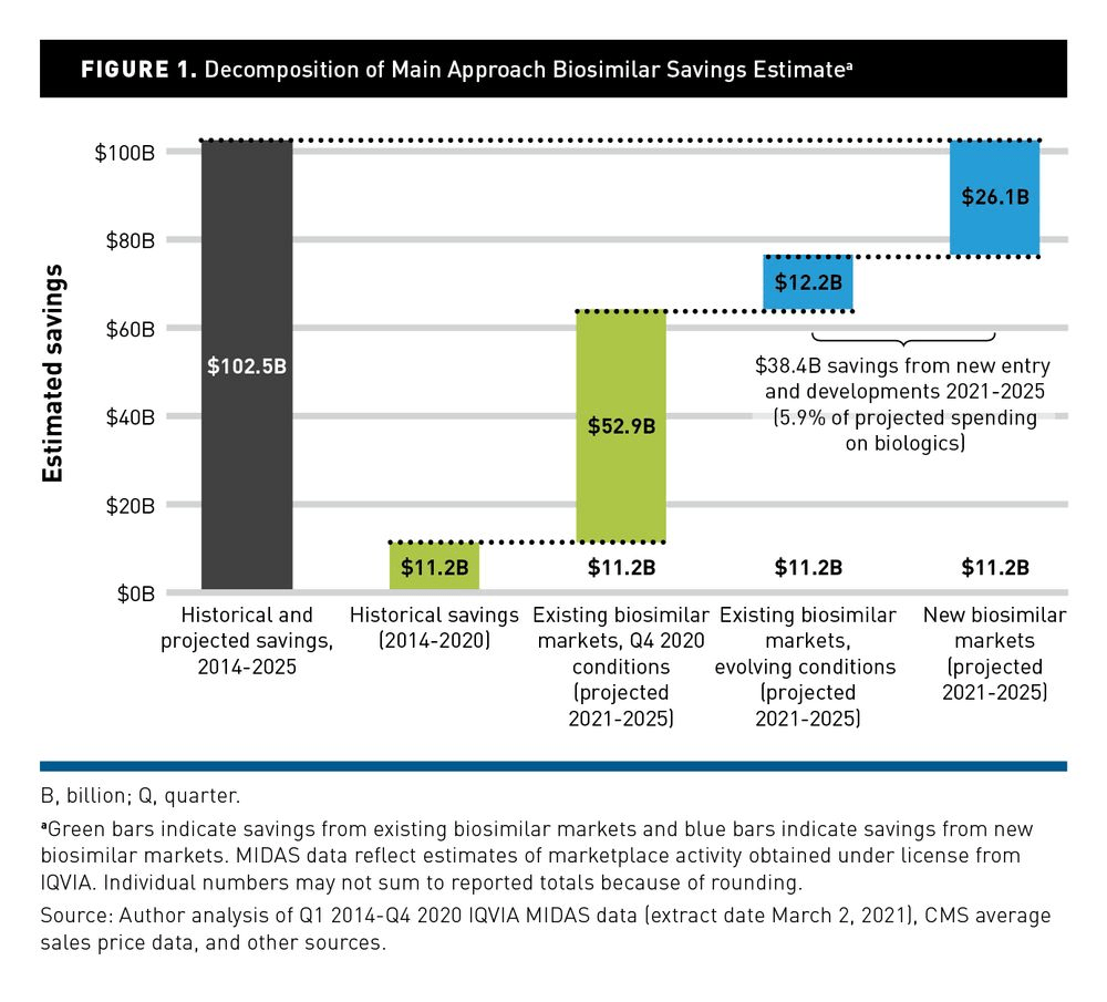 Los ahorros proyectados de los biosimilares de 2021 a 2025 fueron de $ 38.4 mil millones en comparación con las condiciones del cuarto trimestre de 2020 y fueron impulsados por la entrada de nuevos biosimilares. Los ahorros fueron de $124.500 millones en un escenario de límite superior.