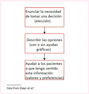 Se pueden distinguir cuatro pasos: (1) el profesional informa al paciente que se va a tomar una decisión y que la opinión del paciente es importante; (2) el profesional explica las opciones y sus ventajas y desventajas; (3) el profesional y el paciente discuten las preferencias del paciente y el profesional apoya al paciente en la deliberación; (4) el profesional y el paciente discuten el deseo del paciente de tomar la decisión, toman o difieren la decisión y discuten el seguimiento. 5) Cuando el caso es complejo, se debe hacer una junta médica, donde los decisores exponen entre sí, el paciente y su familia, le ofrecen las opciones y dejan constancia. Es un procedimiento donde se sinceran expectativas y riesgos, y el paciente accede a acompañar con su voluntad hacer ese recorrido.