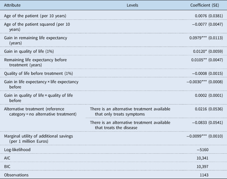 Los resultados de los análisis para evaluar la asociación entre la preferencia por la calidad de vida y la esperanza de vida antes y después del tratamiento y la preferencia por la ganancia en la calidad de vida y la esperanza de vida se muestran en las Tablas 4 y 5 . Tabla 4muestra que tanto una mayor ganancia en la esperanza de vida restante como una mayor esperanza de vida restante antes del tratamiento aumentan la probabilidad de mantener el reembolso del tratamiento. Sin embargo, el coeficiente negativo del efecto de interacción indica que si la esperanza de vida restante antes del tratamiento es más alta, las personas otorgan menos valor a la misma ganancia en la esperanza de vida. La calidad de vida antes del tratamiento no tiene un efecto estadísticamente significativo sobre la probabilidad de desinvertir en un tratamiento.
