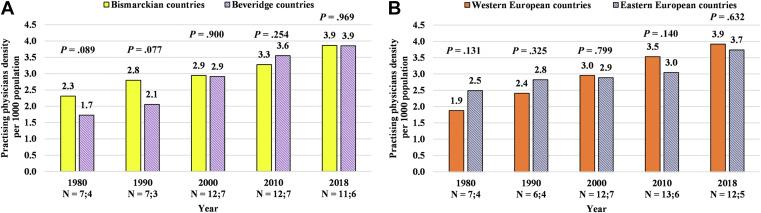 En 1980, los países bismarckianos tenían un mayor número de médicos en ejercicio por 1000 habitantes (2,3 personas) que los países tipo Beveridge (1,7 personas). Esta diferencia fue más moderada en 2010; hubo un cambio a la inversa con los países de tipo Beveridge que tienen un número más alto. Para 2000 y 2018, la diferencia entre los 2 tipos de sistemas de atención médica había desaparecido por completo y ambos grupos de países tenían un promedio de 3,9 a 3,9 médicos por 1000 habitantes en 2018.