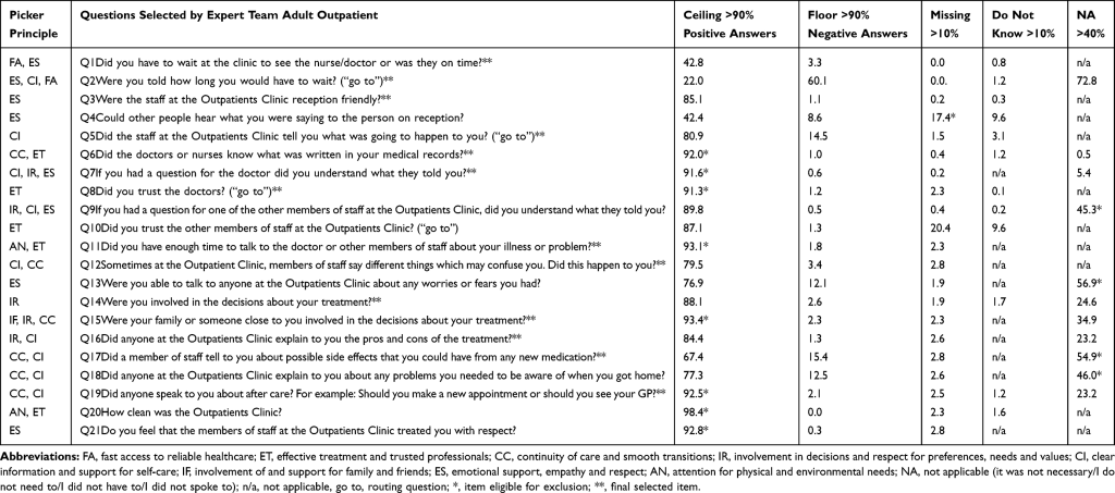 La selección provisional de aproximadamente 21 ítems se redujo a 14 ítems evaluando relevancia, efectos techo o respuestas faltantes en primer lugar. Además, un panel de expertos siguió un enfoque basado en la teoría para la inscripción definitiva de artículos. Metodológicamente, un enfoque común es administrar un cuestionario y seleccionar elementos utilizando el análisis de componentes principales (PCA) y la teoría de respuesta al elemento (IRT). 29 , 30Con los datos de los cuestionarios originales del Instituto Picker, probablemente podríamos haber investigado más fácilmente mediante el Análisis de componentes principales o la Teoría de respuesta al ítem qué ítem según el principio de Picker es mejor seleccionar. Sin embargo, no queríamos sobrecargar a los pacientes innecesariamente con los cuestionarios inicialmente largos de 67 a 87 ítems. También esperábamos que estos largos cuestionarios afectaran negativamente la tasa de respuesta. De este modo, seleccionando únicamente en estadística se obtienen ítems mejorables en teoría, pero que pueden ser de poca importancia para la práctica clínica (pacientes o profesionales sanitarios). En la práctica, un ítem de baja puntuación en las estadísticas puede ser una condición clave para una buena experiencia.