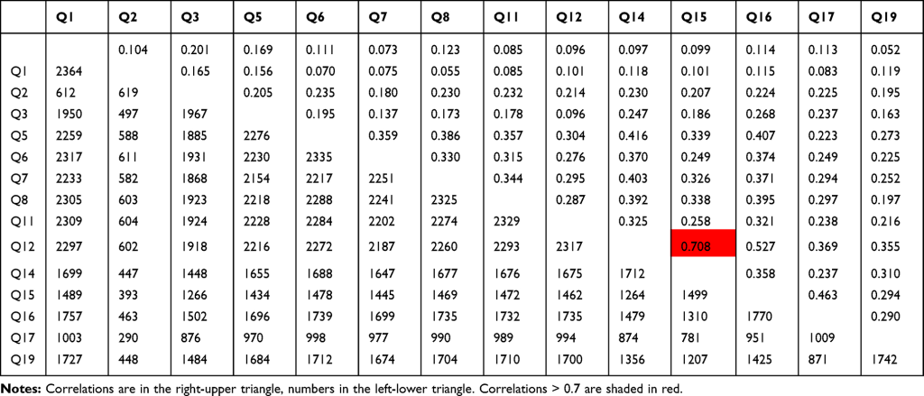 Dado que los cuestionarios se desarrollaron con el objetivo de mejorar la calidad, se siguió un enfoque basado en la teoría para el registro definitivo de los elementos en lugar de un enfoque basado en datos. 29 , 30Un enfoque basado en datos, como la realización de análisis de Rasch o análisis de componentes principales seguidos de análisis de confiabilidad para la reducción de ítems, se adapta mejor a los cuestionarios con muchas preguntas por dominio. Esto no es aplicable aquí, ya que solo hay unas pocas preguntas para cada dominio y queremos mantener los ocho dominios. El enfoque basado en la teoría significa que los elementos elegibles para la exclusión fueron revisados cuidadosamente por el equipo de expertos y los representantes de un consejo de pacientes antes de la exclusión definitiva (verificación de miembros). Por ejemplo, no se excluyó el ítem cuando representaba un componente esencial de la PCC según los principios de los institutos Picker o se consideraba de gran importancia para la IC, a pesar de un efecto suelo-techo o poca relevancia. De la selección final de ítems se calcularon los coeficientes de correlación de Spearman,