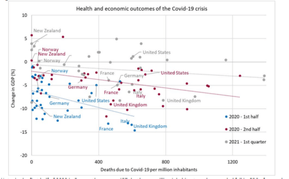 Nota: en el primer semestre de 2020 en Francia, hubo 457 muertes por millón de habitantes y se registró una caída del PIB de alrededor del -13% en comparación con el mismo período de 2019. Las líneas indican la relación de correlación para cada período. Fuente: Algan et al., 2022 Los tratamientos de política para combatir la infección causaron efectos secundarios. Los esfuerzos para mitigar las consecuencias directas para la salud pública de COVID-19 (en forma de enfermedades y muertes relacionadas con la infección) no solo pueden tener efectos negativos en otras dimensiones (por ejemplo, la economía), sino que también pueden tener consecuencias adversas indirectas adicionales para la salud pública. Y «así como las políticas diseñadas para promover la salud pública han tenido consecuencias adversas para la salud no deseadas, las políticas diseñadas para preservar la economía a veces han tenido efectos opuestos» (Darden et al., 2021).