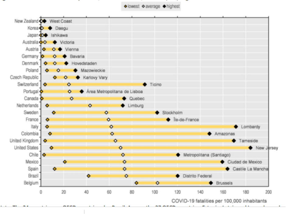 Gráfico 2A: Muertes por COVID-19 por cada 100 000 habitantes, regiones NUTS-2 (TL2) a noviembre de 2020. Nota: Los 24 países son países de la OCDE más Brasil. Entre los 37 países de la OCDE, Estonia, Letonia y Luxemburgo no tienen regiones de nivel NUTS 2; no hay datos a nivel NUTS 2 para Islandia, Irlanda, Israel, Finlandia, Grecia, Hungría, Lituania, Noruega, República Eslovaca y Eslovenia. En el caso de Nueva Zelandia, las juntas de salud de distrito disponen de datos. Para Canadá y Japón, faltan una provincia (Isla del Príncipe Eduardo) y una prefectura (Iwate) respectivamente. Para los Estados Unidos, sólo se consideran los 50 Estados. Los datos se recuperaron entre el 24 de octubre y el 2 de noviembre. Fuente: OCDE. (2020). El impacto territorial del COVID-19: Gestión de la crisis en todos los niveles de gobierno.
