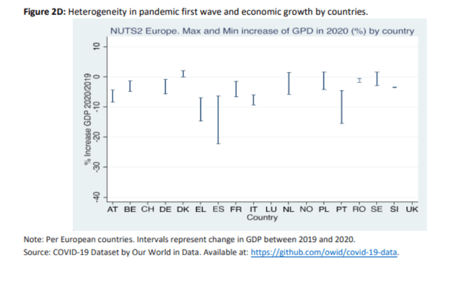 Gráfico 2D: Heterogeneidad en la primera ola pandémica y crecimiento económico por países. Nota: Por países europeos. Los intervalos representan el cambio en el PIB entre 2019 y 2020. Fuente: Conjunto de datos COVID-19 de Our World in Data. Disponible en: https://github.com/owid/covid-19-data. 7 De la literatura previa es bien sabido que factores como la demografía (composición por edades), la estructura económica (peso relativo de los sectores más expuestos a la infección) y las variables culturales y educativas (aceptación de la vacuna) son factores relevantes para comprender la diversidad de la lucha contra el Covid19 y las consecuencias de la pandemia.