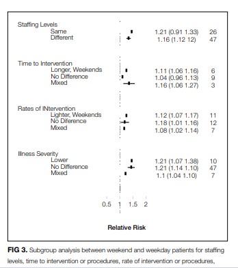 Nuestros resultados de aumento de la mortalidad durante el fin de semana corroboran lo encontrado en estos dos metanálisis. Sin embargo, nuestro estudio difiere en que examinamos específicamente solo la mortalidad de fin de semana y no incluimos la atención fuera del horario laboral en días laborables, que se incluyó en la mortalidad fuera de horario en los otros metanálisis.18,19 Se ha propuesto que las diferencias en el personal de los trabajadores de la salud entre fines de semana y días de semana contribuyen al aumento observado en la mortalidad.7,16,20 Los datos indican que los niveles más bajos de enfermería se asocian con un aumento de la mortalidad.10, 21-23 La presencia de menos especialistas médicos experimentados y/o menos médicos puede contribuir al aumento de la mortalidad.24-26 Menos personal o menos experimentado durante los fines de semana puede contribuir a insuficiencias en las entregas y/o transferencias de pacientes, retrasos en la evaluación y/o intervenciones de los pacientes y la continuidad general de la atención para los pacientes recién admitidos.27-33 Nuestros datos muestran poca evidencia concluyente de que la mortalidad de fin de semana versus la mortalidad entre semana varíe según las diferencias de nivel de personal. Si bien el RR estimado de mortalidad difiere en magnitud para las instalaciones sin diferencias en la dotación de personal durante los fines de semana y los días laborables frente a las que tienen una diferencia en los niveles de personal, ambos estiman un aumento de la mortalidad los fines de semana, y la diferencia en estos efectos no es estadísticamente significativa. Cabe señalar que no hubo diferencias en la mortalidad para los pacientes de fin de semana (versus días laborables) donde no hubo diferencias entre el personal de fin de semana y el de lunes a viernes; Estos estudios se realizaron típicamente en unidades o centros de alta agudeza donde la expectativa general es una cobertura de personal uniforme 24/7/365. Se ha sugerido que una disminución en el uso de intervenciones y/o procedimientos los fines de semana contribuye al aumento de la mortalidad de los pacientes ingresados los fines de semana.34 Varios estudios han asociado tasas más bajas de fin de semana con una mayor mortalidad para una variedad de intervenciones,13,35-37 aunque algunos otros estudios han sugerido que las tasas de procedimientos más bajas los fines de semana no tienen ningún efecto sobre la mortalidad.38-40 Las tasas más bajas de fin de semana de procedimientos diagnósticos relacionadas con tasas de mortalidad más altas pueden exacerbar la mortalidad subyacente. disparidades en la atención médica.41 Nuestros resultados no muestran de manera concluyente que una disminución de la tasa de intervención y / o procedimientos para los pacientes de fines de semana se asocie con un mayor riesgo de mortalidad durante los fines de semana en comparación con los días de semana. También se ha sugerido que los retrasos en la intervención y/o el procedimiento los fines de semana contribuyen al aumento de la mortalidad.34,42
