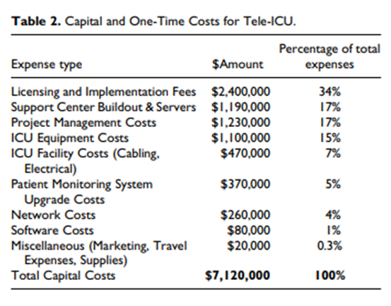 El costo de capital requerido para instalar un solo centro de comando de la tele-UCI que cubra 116 camas de UCI se detalla en la Tabla 2.69 El costo operativo anual de todo el sistema oscila entre $ 2 y $ 2.5 millones, que se subdivide en salarios del personal de la tele-UCI, beneficios, tarifas de licencia de software y costo de suministros de oficina de tele-UCI.