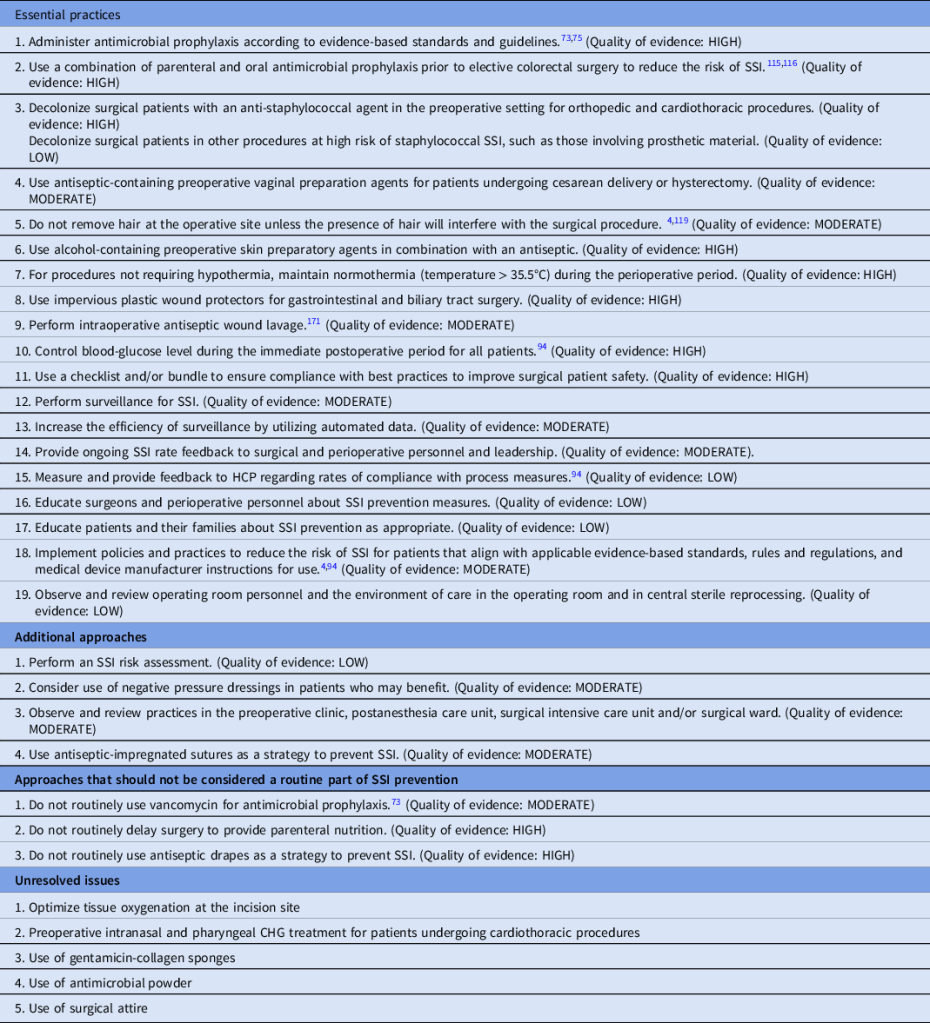 Esta sección enumera los principales cambios de las Estrategias para prevenir infecciones del sitio quirúrgico en hospitales de cuidados agudos: actualización de 2014 , Referencia Anderson, Podgorny y Berríos-Torres1 , incluidas las recomendaciones que se agregaron, eliminaron o modificaron. Las recomendaciones se clasifican como prácticas esenciales que deben ser adoptadas por todos los hospitales de cuidados intensivos (en 2014, estas eran «prácticas básicas», renombradas para resaltar su importancia como base para los programas de prevención de infecciones asociadas a la atención médica (HAI, por sus siglas en inglés) de los hospitales) o enfoques adicionales que se pueden considerar para su uso en ubicaciones y/o poblaciones dentro de hospitales cuando las ISQ no se controlan después de la implementación de prácticas esenciales (en 2014 se denominaron “enfoques especiales”). Consulte la Tabla 1 para obtener un resumen completo de las recomendaciones contenidas en este documento.