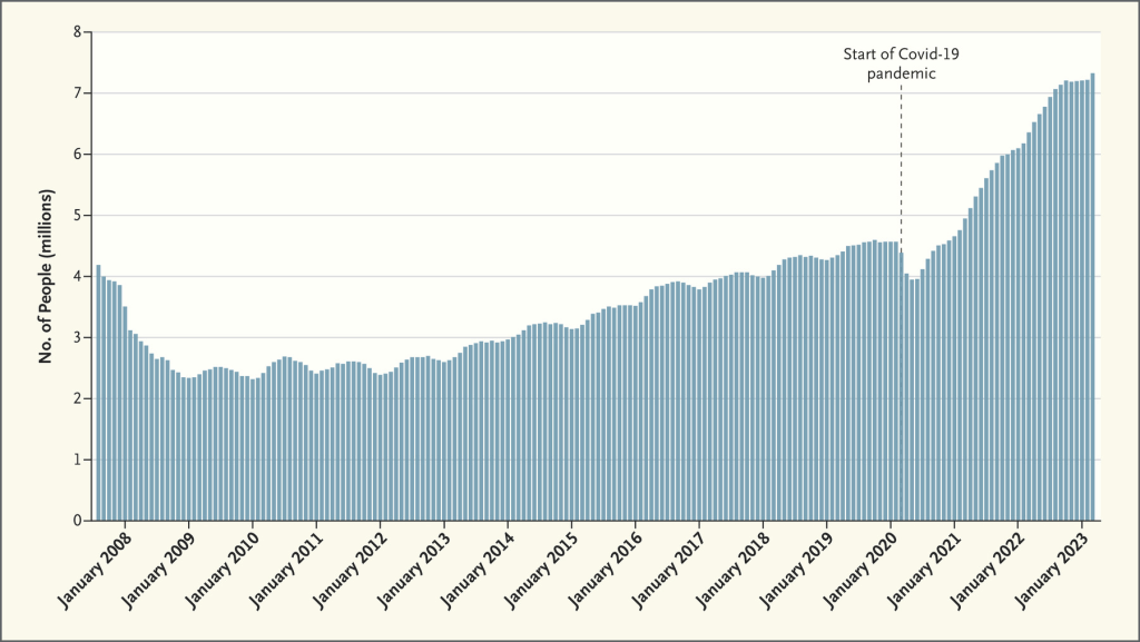 En el contexto de esta aguda crisis, las listas de espera para la consulta de especialistas han ido creciendo y ahora superan los 7 millones de pacientes (en un país de 66 millones de habitantes), frente a los 4,4 millones de antes de la pandemia (ver gráfico ) . 1 Existe un consenso sustancial sobre las causas de estas crisis, aunque diferentes expertos ponderan los factores contribuyentes de manera diferente.