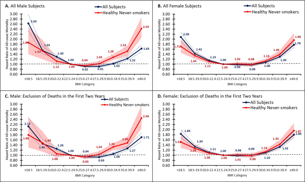 Durante una mediana de seguimiento de 9 años, murieron 75 807 personas. El riesgo de muerte se mantuvo aproximadamente igual para los adultos cuyo IMC varió de 22,5 a 29,9. Pero el riesgo de mortalidad aumentó significativamente para los adultos con un IMC de 30 o más, considerados obesos u obesos graves, y los adultos con un IMC inferior a 18.5, considerados con bajo peso.