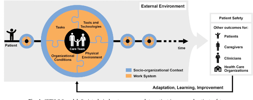 Los primeros cuatro enfoques de HFE se centran en aspectos específicos de HFE y la seguridad del paciente: usabilidad de la tecnología, error humano, desempeño clínico y resiliencia. Se han propuesto varios enfoques de HFE para describir sistemas más completos de atención al paciente, como el enfoque de sistemas propuesto por Vincent y sus colegas 14 , 31 y el modelo de sistema de trabajo y seguridad del paciente SEIPS (Iniciativa de Ingeniería de Sistemas para la Seguridad del Paciente) propuesto por Carayon y sus colegas. 32 Vincent y colegas 14definió siete tipos de factores del sistema que pueden influir en la práctica clínica y dar lugar a incidentes de seguridad del paciente, tales como factores del paciente, factores de tareas y tecnología, y factores organizativos y de gestión. El modelo SEIPS de sistema de trabajo y seguridad del paciente 32 identifica un conjunto ligeramente diferente de factores del sistema: factores individuales (que incluyen características del personal y del paciente), tareas, herramientas y tecnologías, factores ambientales y organizacionales (que incluyen factores de equipo). Además de definir el sistema y enfatizar las interacciones del sistema, 33el modelo SEIPS describe cómo el diseño del sistema puede influir en los procesos de atención y otros procesos relacionados (p. ej., entrega de suministros, limpieza, compra de equipos médicos). Debido a que el modelo SEIPS está anclado en HFE, los resultados de los empleados y de la organización se abordan junto con la seguridad del paciente, lo que refleja el hecho de que la seguridad del paciente y la seguridad y el bienestar del trabajador están positivamente correlacionados y tienen factores comunes que contribuyen al sistema. 34