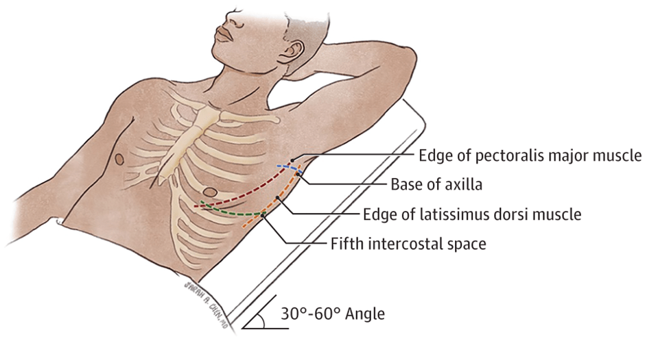 La colocación de un tubo torácico es importante y se realiza por muchas especialidades diferentes en diversos entornos. El punto ideal de inserción es a través de un espacio de referencia externo conocido como el triángulo de seguridad (Figura 2), que está bordeado por el borde del músculo dorsal ancho, el músculo pectoral mayor, la base de la axila y transversal a la línea del pezón o pliegue inframamario, en o por encima del quinto espacio intercostal. 13,14,18-20 Sin embargo, la colocación de los tubos torácicos también está influenciada por la indicación. Para un neumotórax apical, se puede colocar un tubo torácico en el segundo espacio intercostal en la línea medioclavicular, aunque menos cómodo para el paciente, y se puede realizar un drenaje adecuado de un neumotórax no loculado mediante inserción lateral en el quinto espacio intercostal. 14,18 Si el tubo se coloca en el triángulo de seguridad, es importante colocarlo en una línea anterior a la columna ilíaca superior anterior. La colocación en el tubo en una línea detrás de este punto de referencia de la superficie puede hacer que el paciente se acueste sobre el tubo cuando está en posición supina y ocluya mecánicamente el tubo. Para un derrame pleural, se puede usar un espacio intercostal inferior para la inserción, pero se debe tener especial cuidado para evitar penetrar el diafragma y, posteriormente, el hígado a la derecha y el bazo y el intestino a la izquierda. 13
