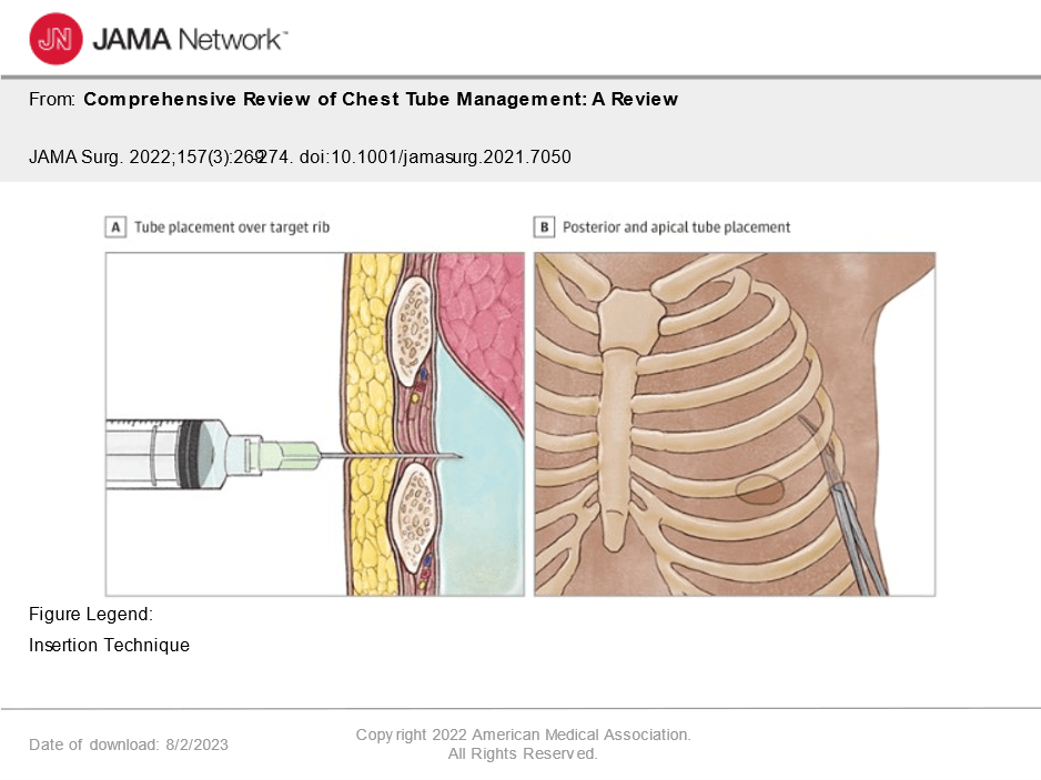 La inserción del tubo de toracostomía, también conocido como tubo torácico, se remonta al siglo V aC cuando Hipócrates describió el uso de un tubo de estaño hueco para drenar lo que probablemente era un empiema. 1 En 1889, se informó por primera vez que los tubos con válvulas con sellos herméticos evitaban que la presión atmosférica externa colapsara el pulmón al inspirarse. 2 En 1922, los tubos torácicos se documentaron por primera vez en el cuidado postoperatorio de pacientes sometidos a cirugía torácica moderna. 3 Se utilizaron durante la Segunda Guerra Mundial para restaurar la función pulmonar después de toracotomías traumáticas, se utilizaron durante la Guerra de Corea y más tarde se convirtieron en el estándar de atención para el drenaje del espacio pleural por trauma durante la Guerra de Vietnam.4 Los tubos torácicos y su manejo continúan evolucionando y se modifican para adaptarse a las necesidades modernas, incluidas las condiciones clínicas asociadas con la pandemia de COVID-19.