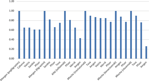Se suponía que los biosimilares se adoptarían rápidamente para generar los ahorros prometidos de miles de millones de dólares. En la Figura 1 se muestra una tendencia global de adopción de biosimilares , que compara la cuota de mercado como porcentaje de las unidades aportadas por los biosimilares con el descuento en comparación con el precio del producto de referencia en 24 países europeos y EE. UU. Nueve países europeos mostraron una adopción del 90 % o más, todo relacionado con la caída de precios y las reducciones de precios más bajas que produjeron la mayor adopción del mercado en algunos casos.