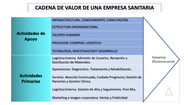 Las organizaciones de salud son sistemas complejos, abiertos, disipativos y adaptativos, que se modifican en relación a las interrelaciones internas de los colectivos intervinientes, profesionales médicos y no médicos, directivos, enfermeros, administrativos, propietarios, pacientes, familiares y las representaciones de los mismos, de redes matriciales, en una organización adhocrática y que responde a las modificaciones del entorno incierto, volátil y ambiguo. Son abiertas porque intercambian productos de atención, energía e información con los pacientes, con su entorno, abiertos al conocimiento y a la evolución tecnológica, abiertos al entorno poblacional, comunitario, y los requerimientos de los pacientes, se produce un intercambio de información en todos los momentos de verdad, mediante un proceso de atención donde hay configuraciones tangibles, apoyadas por una organización que no se ve donde están las actividades básicas de la cadena de valor que son intangibles, constituidas por la infraestructura del conocimiento, el talento humano, la logística, los procesos de compra y los sistemas de información. •Las actividades o modelos de prestación de servicios, en el sector que competimos son integrales e integradas, en equipos de trabajo multidisciplinarios, que conforman en una relación de agencia entre redes internas de “compradores-vendedores” , donde acompañan al paciente, a cada paciente, en un recorrido customizado o personalizado para “comprar” información, mantenimiento de la funcionalidad de la estructura y logística, por cuenta y orden de ellos, en una cesión de la iniciativa y el poder en función de una delegación mediada por la confianza que realizan los pacientes. La actividad principal de la empresa es dar servicios prestadores de salud a través del conocimiento, la actitud y la aptitud del equipo de salud y el trabajo en equipo. Ayudados por las actividades de apoyo, que nos permiten atender con eficiencia. Que en general en la servucción son intangibles para los usuarios. Pero los que solicitan estudios complementarios deben saber el tiempo de realización, la entrega de resultados, la secuencia lógica, el uso correcto de la capacidad instalada.