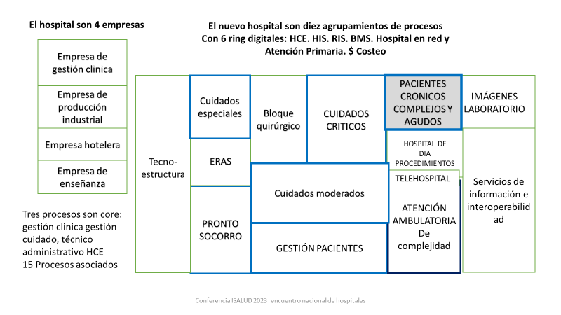 Esta serie del blog, titulada hospital del futuro, smart, fluido, lean y verde, involucrará presentaciones que nutrirán las intervenciones en las jornadas nacionales de Hospitales, Clínicas y Sanatorios. En este caso abordaré uno de los hospitales dentro del mismo establecimiento el de los pacientes crónicos complejos, constitutivo de una unidad integral liderada por case manager y enfermeros de vinculación, que tendrán diseños matriciales de recorridos asistenciales en áreas de emergencia, cuidados moderados, terapia intensiva, cirugía ERAS, y te corta estancia, área de procedimientos, teleconsulta, telegestión de pacientes. El hospital del futuro son agrupamientos de procesos en relación a la necesidad de cuidado de los pacientes, por lo tanto , se tendrá que definir un área de emergencias, urgencias y demanda no programada, un área de alta complejidad y especialidades ambulatorias, otra de procedimientos, de hospital de día, de cuidados moderados, de cirugía ERAS, de cuidado del paciente crítico cardiológico, clínico, postquirúrgico, de pacientes pediátricos o neonatales, cuidados postoperatorios, un área de telemedicina del hospital. Un sistema de información que preserve los seis anillos digitales que requiere el hospital para su funcionamiento (Historia clínica informatizada o electrónica única, Hospital Information System, el Radiologic Information System, Building Management System, del hospital en red con el resto de los prestadores y con los sistemas de provisión logística, compra y costeo), el área de quirófano o el bloque quirúrgico y la tecnoestructura que normalice la seguridad y la calidad. Los muros estarán sobrepasados por brazos extendidos del hospital, tendrá un comando para seguir a los pacientes, la producción y el edificio y la gestión por procesos lean. Será más tecnológico, más humanizado y para cuidados progresivos.