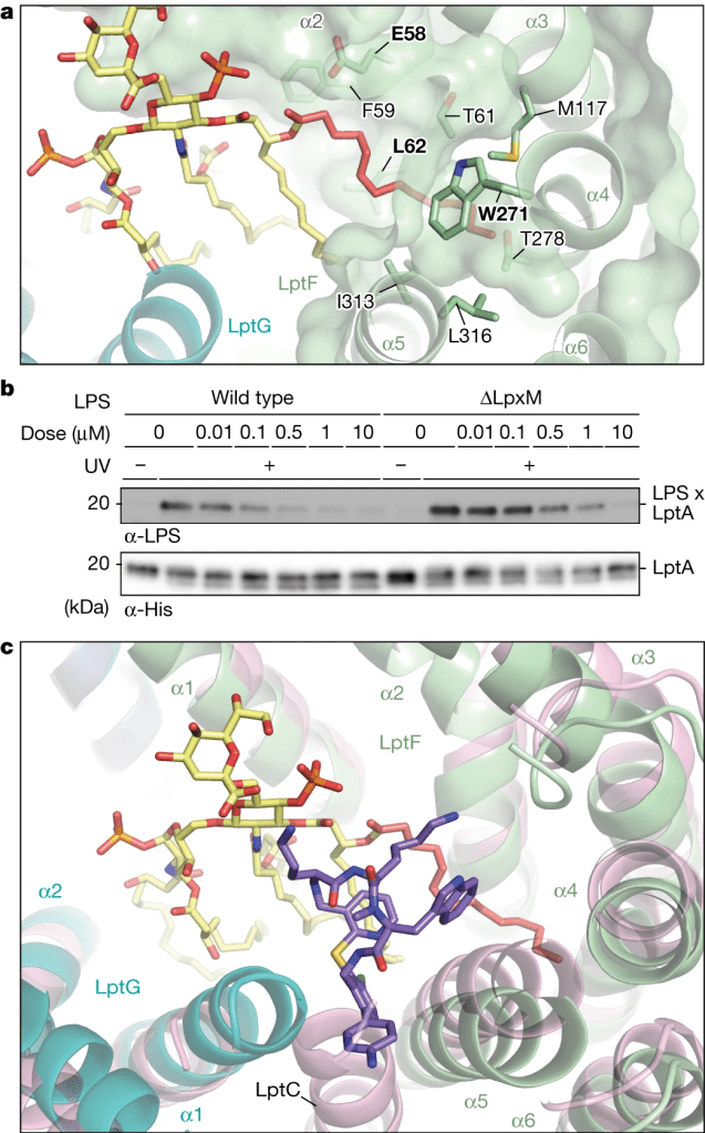 La estructura compleja ternaria también mostró una extensa interfaz entre LPS y 1 . Por lo tanto, intentamos determinar si cambiar la estructura del LPS en Acinetobacter afectaría la potencia inhibidora de 1 . La biosíntesis de LPS involucra más de 100 genes 1 , 9 , 30 , pero las mutaciones que confieren una menor susceptibilidad al compuesto fueron mutaciones de pérdida de función en lpxM (Datos ampliados, figura 5 ). LpxM realiza los pasos finales de acilación durante la biosíntesis de LPS y del área de contacto total de aproximadamente 230 Å 2 entre LPS y 1 , 94 Å 2 (41%) involucra el área de contacto entre el fármaco y la cadena de acilo instalada por LpxM (refs. 31 , 32 , 33 ) (Fig. 3a ). En una reconstitución bioquímica, el transporte de LPS aislado de una cepa de deleción LpxM de E. coli fue posible a concentraciones 20 veces mayores del compuesto 1 que las requeridas para inhibir el transporte de la estructura de LPS de tipo salvaje coincidente (Fig. 3b ). Los quimiotipos de LPS de E. coli y Acinetobacter Δ lpxM tienen patrones de acilación idénticos. De acuerdo con los experimentos bioquímicos que utilizan LPS Δ lpxM de E. coli , encontramos que la cepa de deleción lpxM de A. baylyi es 30 veces menos susceptible a 1 que la de tipo salvaje. Estudios previos en E. coli y A. baumannii han establecido que la pérdida de las cadenas de acilo graso instaladas por LpxM no impide el transporte de LPS a la membrana externa pero sí reduce la función de barrera de la membrana externa 34 , 35 . De acuerdo con esto, nuestra cepa A. baylyi ΔlpxM era hasta 1000 veces más susceptible a una amplia gama de otros antibióticos (Tabla complementaria 2 ). Debido a que se sabe que las cepas ΔlpxM tienen una virulencia reducida, la pérdida de lpxM puede no causar una susceptibilidad reducida a los péptidos macrocíclicos in vivo 35 , 36 .