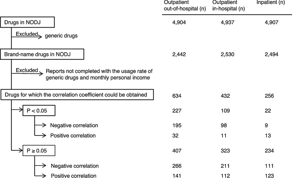 En el caso de las personas de 75 años o más, las personas que pertenecen a grupos de ingresos altos que pagan el 30% de sus costos bajo el sistema de seguro universal público de Japón tienen más probabilidades de elegir medicamentos de marca que aquellos en grupos de ingresos generales que pagan el 10% de sus costos [8]. En una revisión sistemática y metaanálisis, los pacientes con ingresos más bajos (es decir, < nivel de pobreza federal del 200%) tenían más probabilidades de usar medicamentos genéricos que aquellos con ingresos más altos (≥ 200% FPL; OR combinado = 1.32, IC del 95% 1.15-1.52) [11]. En los Estados Unidos, se ha informado que los programas de descuento en medicamentos genéricos son una opción para proporcionar medicamentos recetados asequibles a personas de bajos ingresos [12]. Los grandes hospitales utilizan un mayor porcentaje de medicamentos genéricos en comparación con las instituciones médicas más pequeñas, como las clínicas [13]. Yokoi y Tashiro identificaron una correlación positiva entre la tasa de prescripción de medicamentos genéricos y el grado de separación entre una práctica médica y los sitios de dispensación de medicamentos [14]. También existen diferencias regionales en el uso de medicamentos genéricos [15, 16]. Además, aunque el gobierno incentiva el uso de medicamentos genéricos, los medicamentos antihipertensivos no son efectivos en áreas de ingresos relativamente altos [15]. Dado que las recetas comprenden las recetas ambulatorias fuera del hospital, las recetas ambulatorias hospitalarias y las recetas hospitalarias, es concebible que la correlación entre la tasa de uso de medicamentos genéricos y el ingreso personal mensual varíe según la diferencia en las recetas. Sin embargo, la correlación entre la tasa de uso de medicamentos genéricos, ordenados por prescripción e ingreso personal mensual, no se ha investigado previamente.