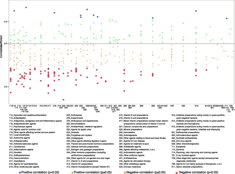 Las proporciones de correlaciones negativas significativas para las prescripciones ambulatorias extrahospitalarias, ambulatorias y hospitalarias fueron del 30,6%, 22,7% y 3,5%, respectivamente. Para las categorías terapéuticas con correlación negativa para las prescripciones ambulatorias extrahospitalarias, el número de antihipertensivos (código: 214), vasodilatadores (código: 217), agentes para úlcera péptica (código: 232) y agentes para hiperlipidemia (código: 218) fueron 16, 13, 12 y 12, respectivamente (Tabla 1 y Fig. 4). Los coeficientes de correlación para los gránulos mezclados con Marzulene® S (l-glutamina, agentes para la úlcera péptica, código: 232), los comprimidos de Gaster® D de 20 mg (Famotidina, agentes para la úlcera péptica, código: 232) y los comprimidos de Cerocral® de 20 mg (tartrato de ifenprodil, otros agentes cardiovasculares, código: 219) fueron: – 0,7058 (valor de p < 0,0001), – 0,6922 (valor de p < 0,0001) y – 0,656 (valor de p < 0,0001), respectivamente (Archivo adicional 2: Cuadro S2).
