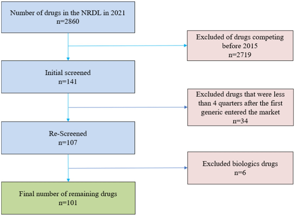 Dado que la Administración Nacional de Seguridad de la Salud unifica y ajusta la NRDL de China, los medicamentos que cumplen con las condiciones básicas de necesidad clínica, seguridad y eficacia se incluyen en la NRDL para su manejo, y los medicamentos incluidos se encuentran en un número elevado, cubren una amplia gama de áreas terapéuticas y todos son suministros clínicos comunes. Es una buena representación de la situación real del mercado de drogas de China. Para investigar la relación entre el número de fabricantes de medicamentos y los precios en el mercado de China continental, seleccionamos medicamentos de los 2.860 medicamentos (1.486 medicamentos occidentales y 1.374 medicamentos chinos patentados) en el NRDL de China de 2021. Los criterios de exclusión fueron los siguientes.