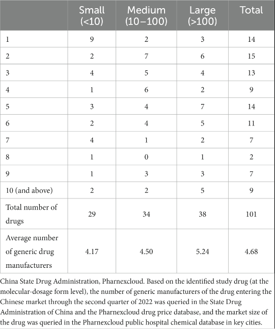 Esperamos que el número de vendedores de genéricos esté altamente correlacionado con el tamaño del mercado en el que compiten, es decir, los mercados más grandes atraerán a más vendedores (32), dividimos el mercado en categorías pequeñas, medianas y grandes, de acuerdo con el promedio del número de medicamentos genéricos vendidos en el momento de su primera entrada en el mercado y la última observación debido al largo período de tiempo, la alta variabilidad en el tamaño del mercado y las excesivas diferencias de precios entre los medicamentos.