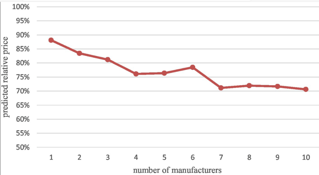 Y, a diferencia de algunos estudios que sugieren que los precios marginales continúan disminuyendo a medida que aumenta el número de competidores, nuestro estudio apoya la opinión de otra parte de la literatura de que el precio marginal disminuye después de aproximadamente cuatro a seis participantes. Encontramos que en los mercados con alrededor de cuatro competidores, los precios relativos disminuyen en un 23,89% (la relación de precios esperada entre el precio promedio de mercado y el precio promedio de la marca de entrada pregenérica es del 76,11%). Por el contrario, en los mercados con 10 competidores, el precio disminuye un máximo del 29,39% en relación con el precio de entrada pregenérico. Esto sugiere que la entrada de los primeros fabricantes de genéricos puede reducir significativamente los precios de los medicamentos, pero los genéricos posteriores no proporcionan las reducciones de precios esperadas.