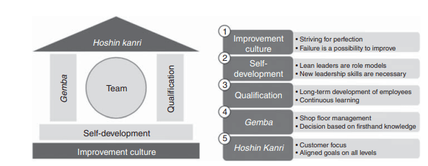 Dombrowski y Mielke (2013)propuso un modelo conceptual para un sistema integrado de liderazgo lean. Su modelo conceptual, que no es específico de la industria, incluye cinco principios básicos de liderazgo lean: cultura de mejora, autodesarrollo, calificación, gemba y hoshin kanri . Todos los cinco componentes contribuyen al concepto central del equipo como unidad central activa en un entorno eficiente. Los equipos que incluyen trabajadores de primera línea son fundamentales para el compromiso de los empleados y la mejora de procesos. Cada uno de los cinco principios se describe en los siguientes párrafos.