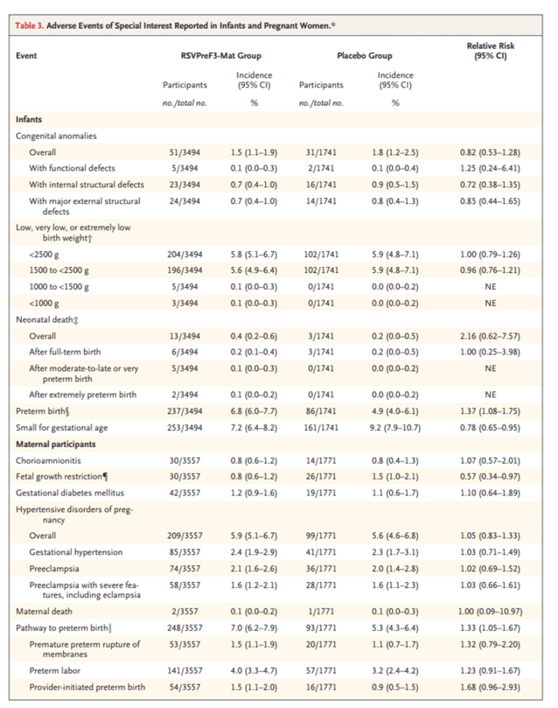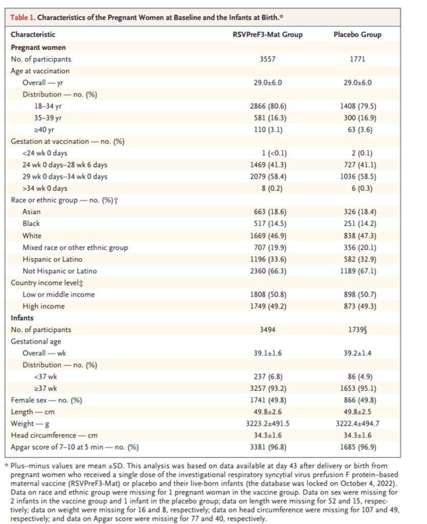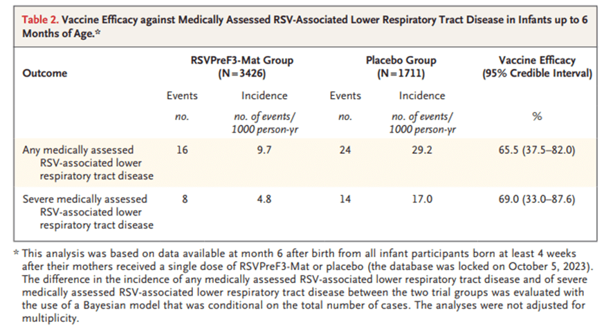 Los análisis incluyeron 5328 gestantes y 5233 lactantes; No se alcanzó el objetivo de inscripción de aproximadamente 10.000 mujeres embarazadas y sus bebés porque la inscripción se detuvo antes de tiempo. Un total de 3426 bebés en el grupo de la vacuna y 1711 bebés en el grupo de placebo fueron seguidos desde el nacimiento hasta los 6 meses de edad; 16 y 24 lactantes, respectivamente, tenían alguna enfermedad del tracto respiratorio inferior asociada al VRS evaluada médicamente (eficacia de la vacuna, 65,5 %; intervalo de credibilidad del 95 %, 37,5 a 82,0), y 8 y 14, respectivamente, tenían enfermedad grave de las vías respiratorias inferiores asociada al VRS evaluada médicamente (eficacia de la vacuna, 69,0 %; intervalo de credibilidad del 95 %, 33,0 a 87,6). El parto prematuro ocurrió en el 6,8 % de los recién nacidos (237 de 3494) en el grupo de la vacuna y en el 4,9 % de los nacidos (86 de 1739) en el grupo de placebo (riesgo relativo, 1,37; intervalo de confianza [IC] del 95 %, 1,08 a 1,74; p=0,01); La muerte neonatal ocurrió en 0,4% (13 de 3494) y 0,2% (3 de 1739), respectivamente (riesgo relativo, 2,16; IC 95%, 0,62 a 7,56; P=0,23), desequilibrio probablemente atribuible al mayor porcentaje de partos prematuros en el grupo vacunado. No se observó ninguna otra señal de seguridad.