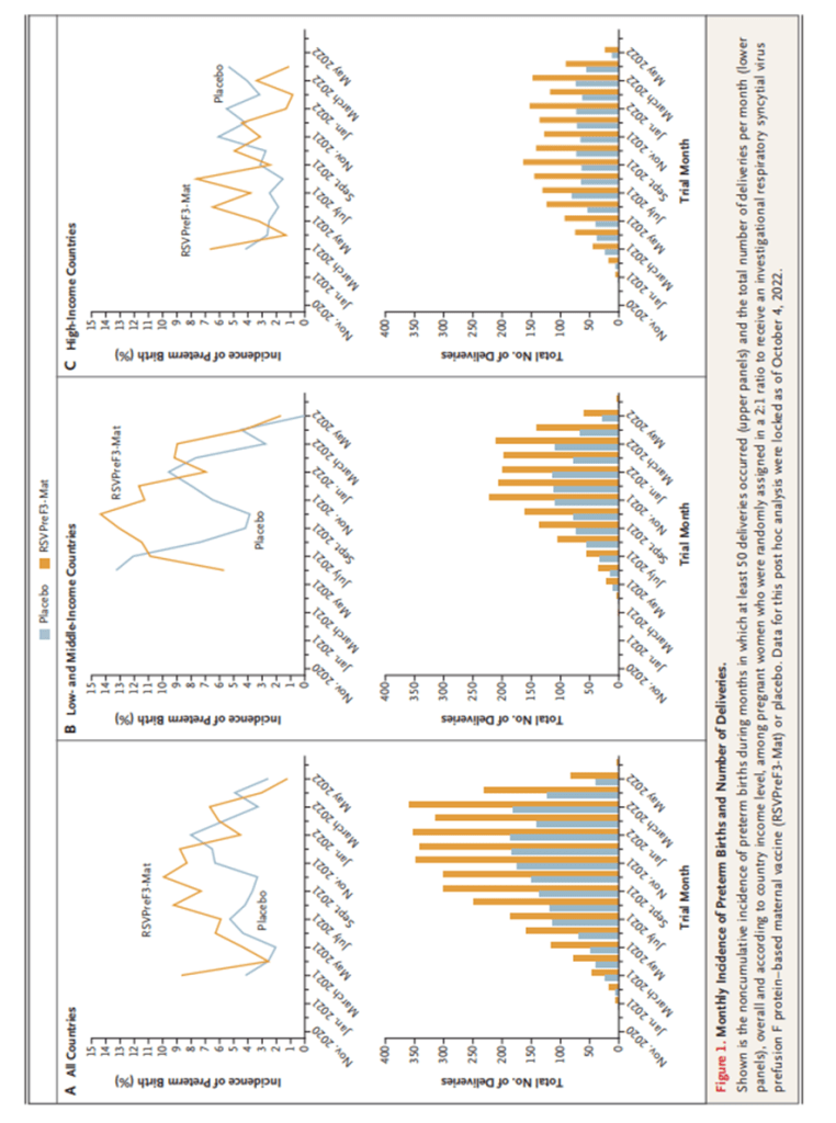 El virus respiratorio sincitial (VRS) es una de las principales causas de enfermedad de las vías respiratorias inferiores en niños pequeños,1,2 con un efecto desproporcionado en los lactantes menores de 6 meses de edad, especialmente en los países de ingresos bajos y medios.3 Se necesitan intervenciones eficaces para prevenir la enfermedad de las vías respiratorias inferiores asociada al VRS en los lactantes. La inmunización materna ha evitado de forma segura millones de casos de tétanos, gripe y tos ferina entre los lactantes de todo el mundo4-7 y podría proteger a los lactantes pequeños contra la enfermedad por VRS.8,9 GSK ha estado desarrollando una vacuna de subunidad contra el VRS para uso materno (RSVPreF3-Mat) que se basa en la proteína de fusión (F) del VRS estabilizada en su conformación previa a la fusión.10,11 En 2020, GSK inició un ensayo de fase 3 (RSV MAT-009) para evaluar la seguridad y eficacia de RSVPreF3-Mat contra el tracto respiratorio inferior asociado al VRS en bebés nacidos de mujeres que habían recibido la vacuna durante el embarazo. A mediados de febrero de 2022, el comité independiente de seguimiento de datos que supervisa el ensayo notificó a GSK un desequilibrio en los nacimientos prematuros en el grupo de la vacuna en comparación con el grupo de placebo. Después de una investigación adicional, GSK detuvo la inscripción y la vacunación el 25 de febrero de 2022 en este ensayo y en todos los demás ensayos en curso de RSVPreF3-Mat en los que participaron mujeres embarazadas. GSK informó de inmediato a las autoridades reguladoras pertinentes, a los comités de ética de los centros de ensayo y a los investigadores; desenmascaró las asignaciones de los grupos de ensayo a los investigadores; y suspendió la inscripción y la vacunación en todos los ensayos de RSVPreF3-Mat en mujeres no embarazadas (consulte el Apéndice complementario, disponible con el texto completo de este artículo en NEJM.org).